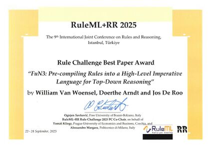Dörthe Arndt, Postdoktorandin am ICCL, wurde für ihre Arbeit „FuN3: Pre-compiling Rules into a High-Level Imperative Language for Top-Down Reasoning” mit dem Rule Challenge Best Paper Award auf der Konferenz RuleML+RR 2025 ausgezeichnet.